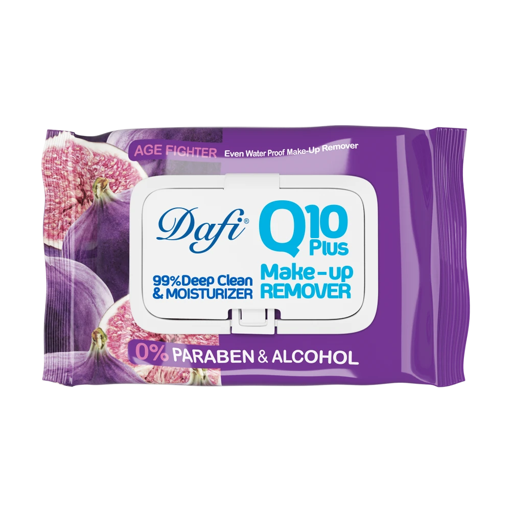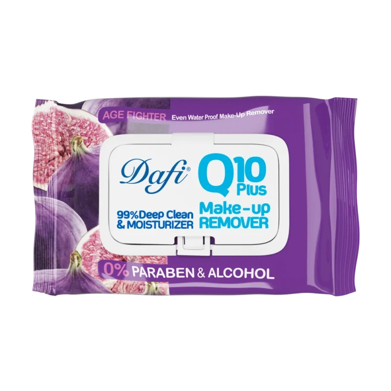 دستمال مرطوب پاککننده آرایش Q10 قوی ترین آنتی اکسیدان میباشد که براساس انواع پوست و نیاز طراحی شده است که شامل تنوع های ضدجوش، ضد التهاب، جوان کننده و آبرسان است. حاوی Q10 که یک کوآنزیم است که موجب تسریع سلول سازی پوست، افزایش کلاژن و در نتیجه جوانسازی میشود. دستمال مرطوب دافی به حفظ آب میان سلولی بعد از تمیز شدن پوست کمک کرده و موجب آلرژی و حساسیت نمیشود. همچنین فاقد پارابن، الکل و صابون است. دستمال پاک کننده آرایش دافی حاوی عصاره انجیر است که موجب شفاف شدن پوست صورت شده و سلولهای مرده پوست را از بین میبرد و به راحتی آرایش چشم و صورت را پاک میکند. دستمال پاک کننده دافی نوع ضد جوش مناسب پوست های چرب، مختلط و جوش دار است و نوع ضد التهاب آن برای پوست حساس و خشک مناسب است.