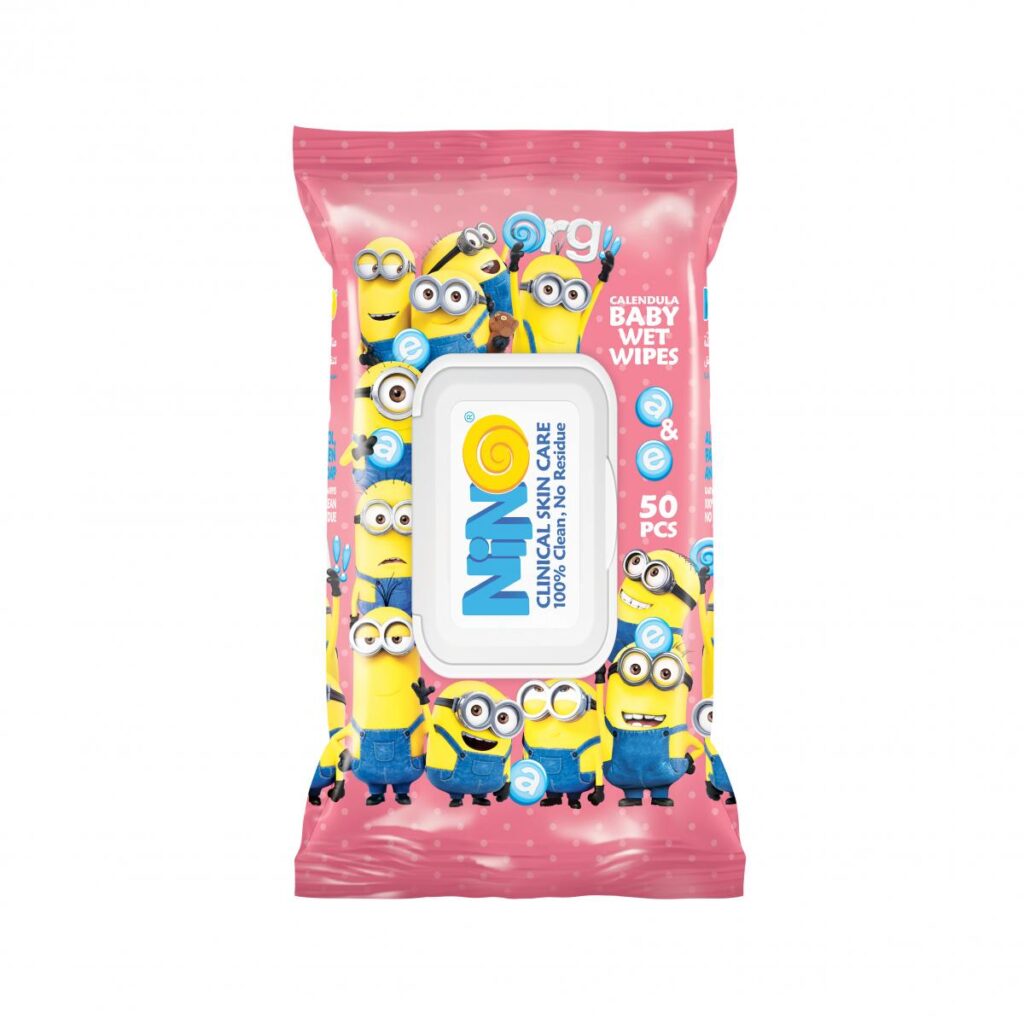 دستمال مرطوب کودک حاوی کالاندولا 50 برگي صورتی مینیون درب دار نینو