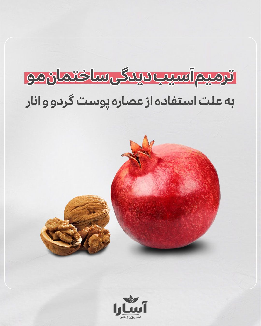 در ترکیبات این محصول از عصاره پوست گردو و انار استفاده شده است که نقش بسیار زیادی در ترمیم آسیب دیدگی ساختمان مو دارند.