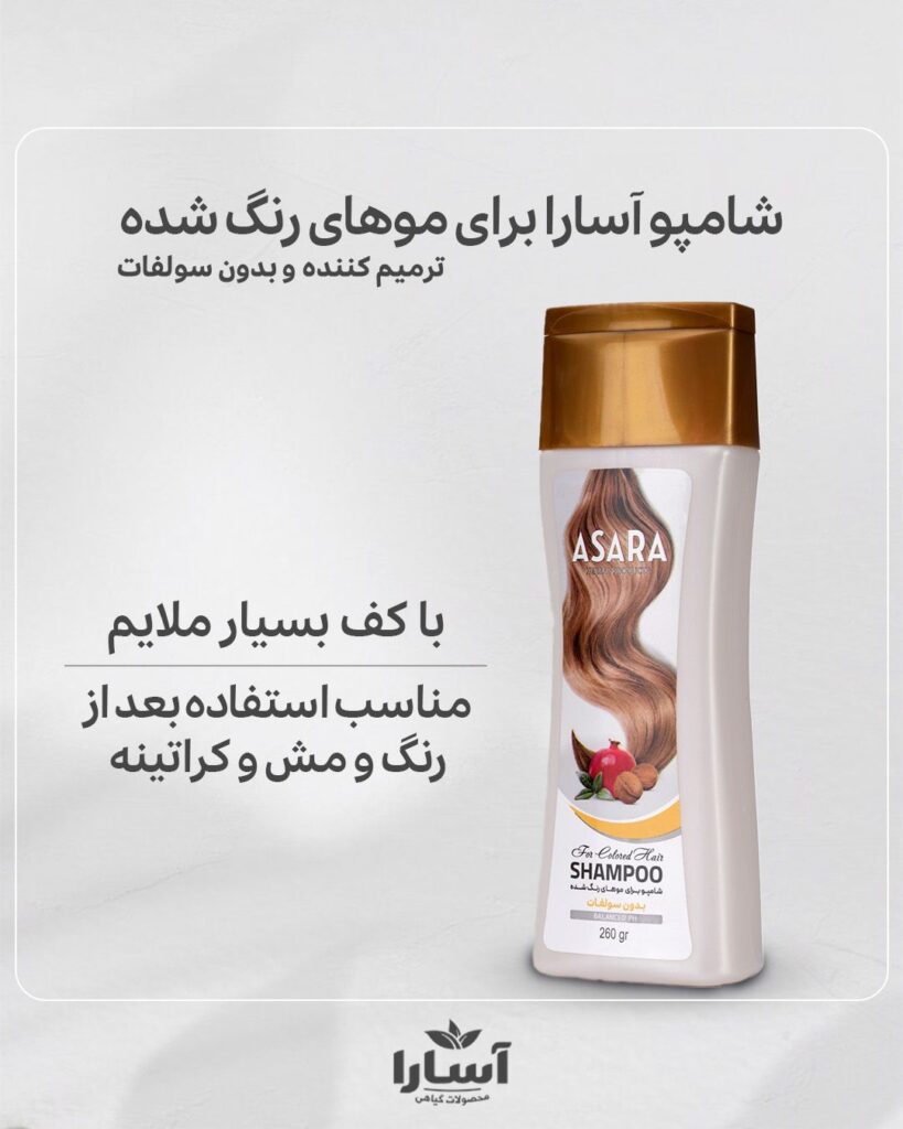 شامپو گیاهی آسارا مخصوص موهای رنگ شده یک محصول تخصصی و بدون سولفات برای ترمیم آسیب دیدگی ساختمان مو می باشد.