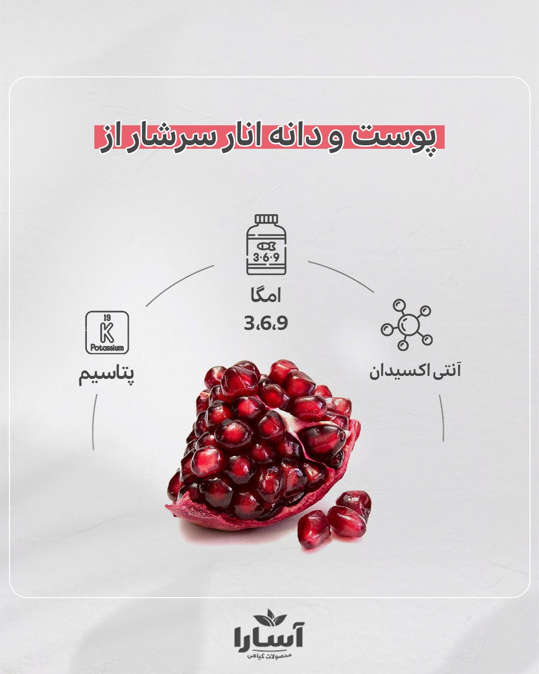 انار سرشار از بتا کاروتن، منیزیم، اسید فولیک، ویتامین های C و خانواده B و آهن است.