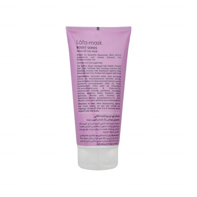 ماسک مو ترمیم کننده لافارر مدل Boost series برای موهای رنگ شده و آسیب دیده مناسب است. این محصول با داشتن عصاره انار و روغن دانه کتان، موجب افزایش درخشندگی رنگ مو ، تثبیت رنگ مو و نرمی مو می شود. ماسک مو لافارر حاوی کراتین هیدرولیز شده است که موهای آسیب دیده را ترمیم کرده و کراتین آنها را بازسازی خواهد کرد. همچنین شانه پذیری مو را آسان کرده و از آن ها در مقابل حرارت سشوار محافظت خواهد کرد. جلوگیری از ایجاد موخوره و وز در مو از دیگر خواص این ماسک مو می باشد.