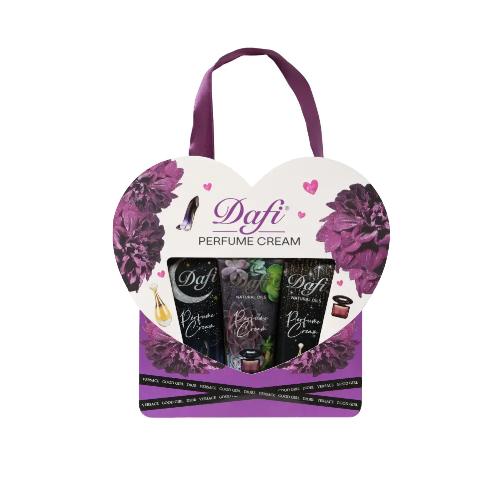 در پک قلبی کرم عطری دافی، 3 عدد کرم عطری از جمله کرم عطری جادور، کرم عطری گودگرل و کرم عطری ورساچه قرار دارد.