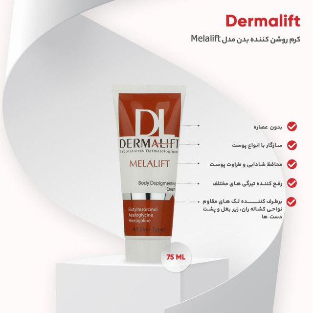 کرم روشن کننده بدن درمالیفت مدل Melalift تیرگیها و لکههای پوستی مقاوم را در نواحی کشاله ران، زیر بغل و پشت دست ها رفع می کند. این ضد لک بدن فاقد عصاره و حاوی قوی ترین و جدیدترین ترکیبات روشن کننده بوده و که موجب روشنتر شدن پوست شده و می تواند اسکار جوش یا زخم، لک های ناشی از نور آفتاب، بارداری و یا پیری را از بین ببرد. با مصرف این کرم پوستی روشن، صاف، سالم و زیبا را برای خود به ارمغان آورید.