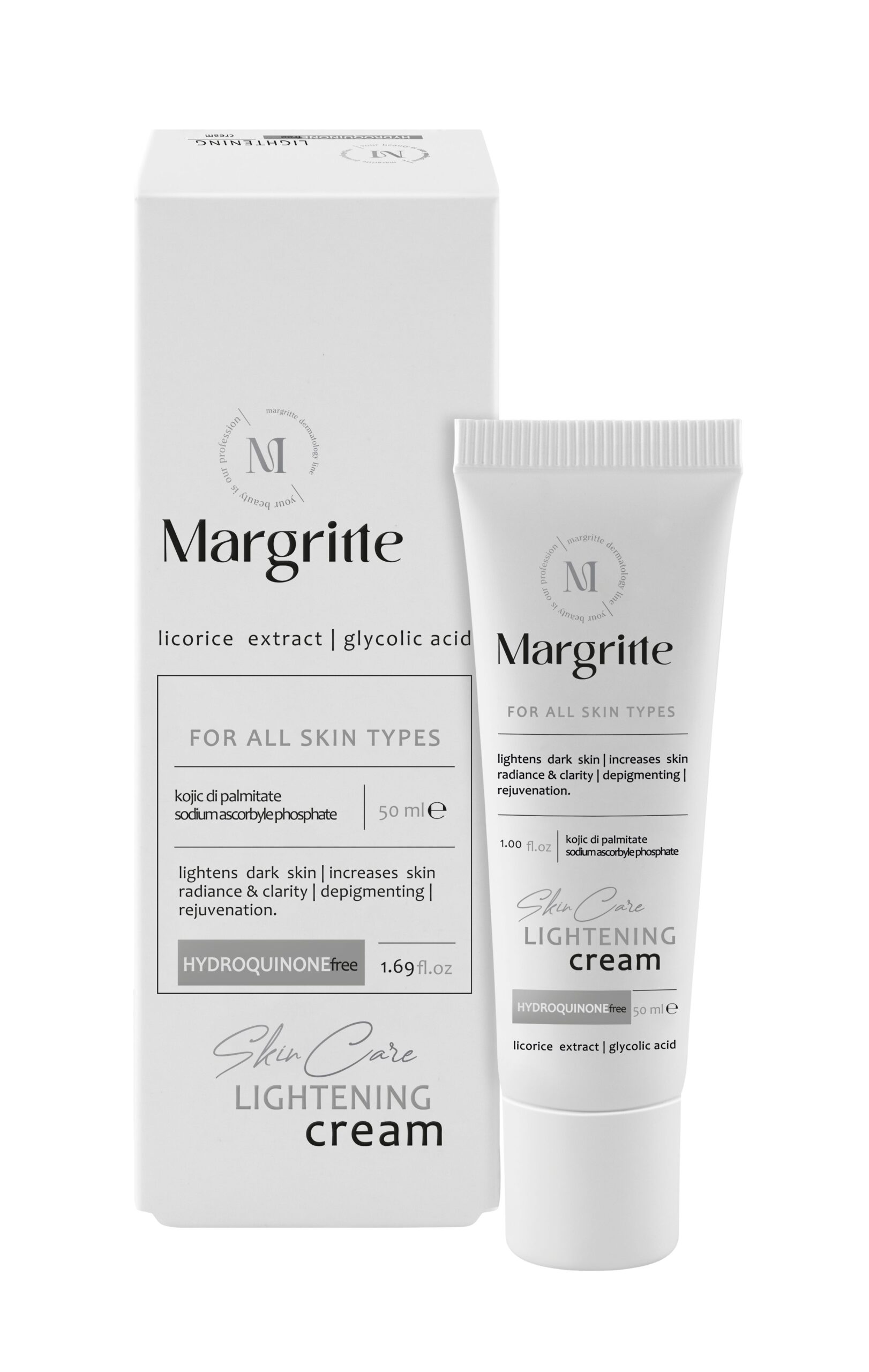 کرم روشن کننده و ضد لک مارگریت حاوی کمپلکس مواد روشن کننده (کوجیک دی پالمیتات، عصاره شیرین بیان و سدیم اسکوربیل فسفات) بوده که به رفع تیرگیها و لکهای پوستی و بهبود رنگ پوست میپردازد. این کرم با لایه برداری سطحی و ملایم موجب جداسازی لایه خارجی، خشن، فرسوده و تیره پوست شده و به برطرف نمودن موثر و تدریجی لکهای پوستی صورت و گردن حاصل از افزایش سن، نور آفتاب و جلوگیری از شکل گیری لکهای جدید به کمک دو عملکرد لایه برداری و روشن کنندگی کمک شایانی میکند. این کرم دارای ترکیبات بسیار ایمن بوده و هرگز روی پوست باعث جوش، آکنه و تحریک نمی شود و فورا جذب پوست شده و بافت بسیار سبکی دارد. در طول مصرف این محصول، خرید کرم ضد آفتاب با درجه محافظتی بسیار بالا ضروری است.