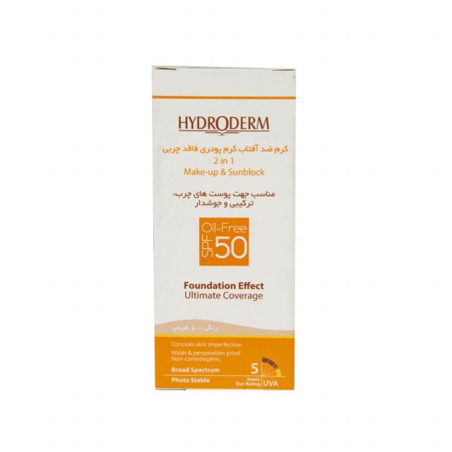کرم ضد آفتاب رنگی هیدرودرم فاقد چربی بوده که برای پوست های چرب، مختلط و جوشدار فرموله شده است. این محصول با داشتن ساختار سیلیکونی، پوششی ابریشمی روی پوست ایجاد کرده و برای مدت طولانی از پوست در مقابل پرتوهای مضر نور خورشید محافظت می کند. همچنین، با تنظیم ترشح چربی پوست، از ایجاد جوش و آکنه جلوگیری می کند. فرمولاسیون ضد آب، مقاومت در برابر تعریق و شستشو و ماندگاری بالا از دیگر ویژگی های این کرم ضد آفتاب است. این محصول دارای رنگ کرم پودری بژ طبیعی بوده و به یکنواخت سازی چهره و پوشاندن ناهمواری های آن کمک می کند.
